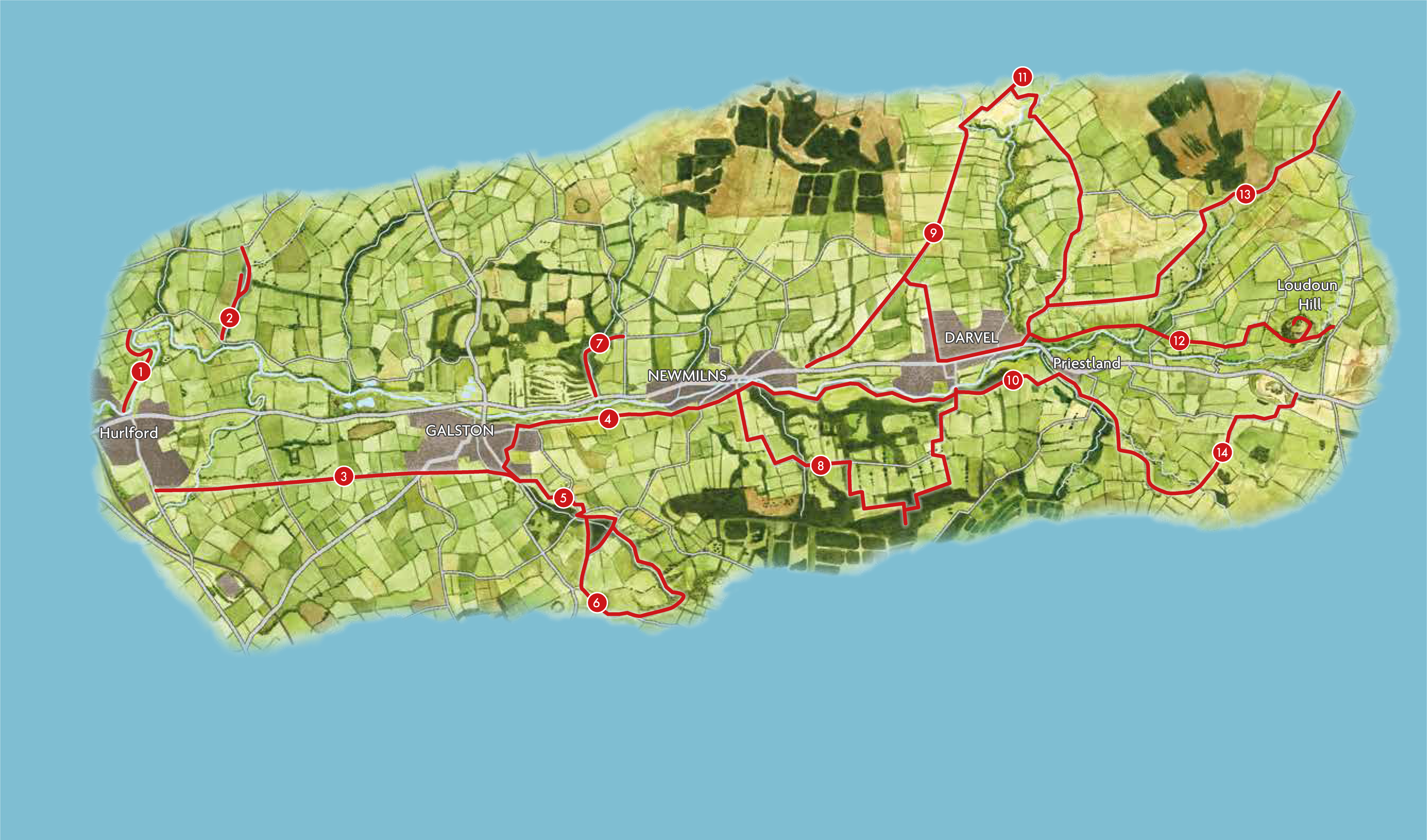The trails link up the communities of Hurlford in the west, through Galston and Newmilns, to Darvel and Loudoun Hill in the east. They also give people access to Whitelee Wind Farm in the north, the River Ayr Way in the south, Kilmarnock in the west, and Strathaven with its surrounding settlements in the east.